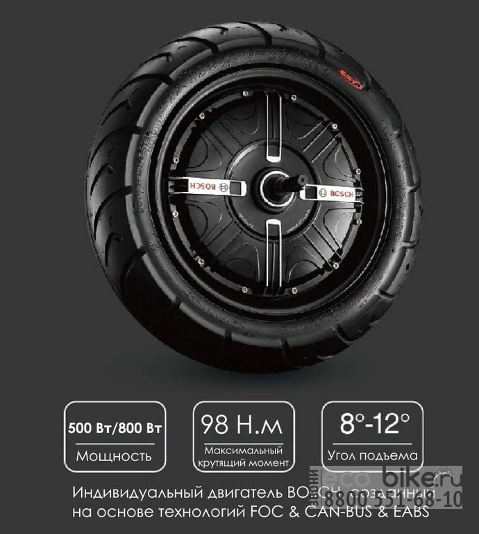 Этот электроскутер оснащён мотор колесом немецкого бренда Bosh с номинальной мощностью 1200W и частатой вращений 400rpm .Имеет 2 режима "D" и 1 режим "R" ,максимальная скорость ограничена программно и составляет 45км/ч за 4,6 секунды.